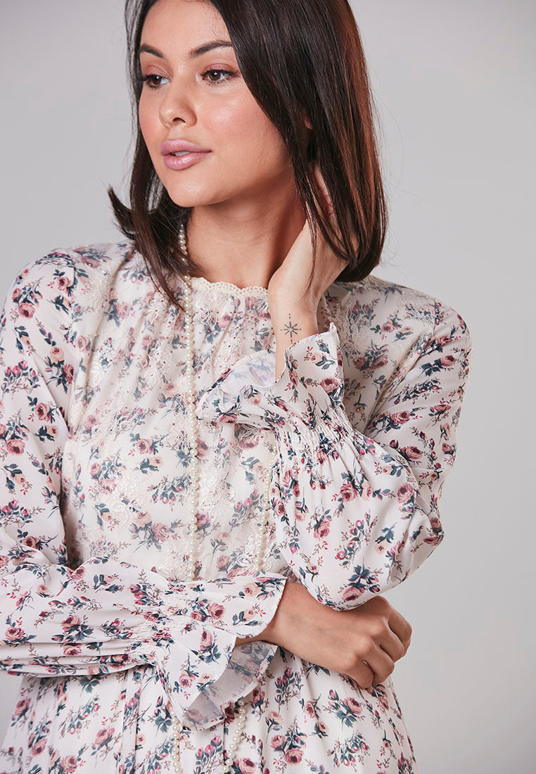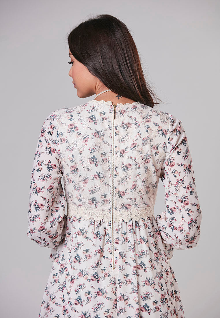 - Maxi Dress printed floral with Netting and Lace Trimmings