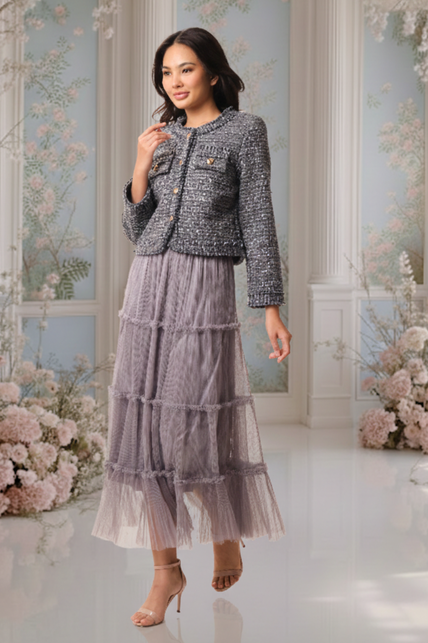 This timeless tweed jacket is crafted from a poly-cotton blend and fully lined for a structured yet comfortable fit. Designed in elegant indigo blue tones, it features a refined round neckline, textured trim, and ornate button detailing that lends a subtle vintage-inspired charm. With its tailored silhouette and classic colour way, this jacket is effortlessly versatile-perfect for elevating both day and evening ensembles with understated sophistication.