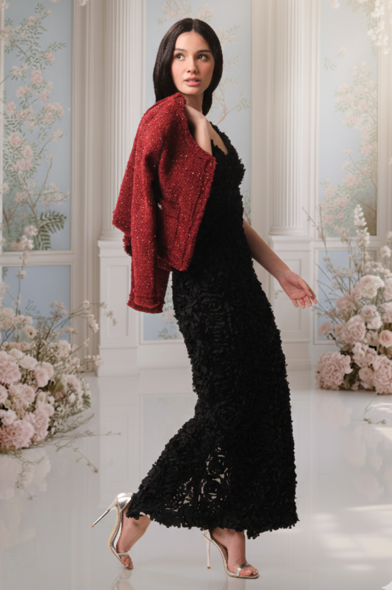 This timeless tweed jacket is crafted from a poly-cotton blend and fully lined for a structured yet comfortable fit. Designed in elegant deep red tones, it features a refined round neckline, textured trim, and ornate button detailing that lends a subtle vintage-inspired charm. With its tailored silhouette and classic colour way, this jacket is effortlessly versatile-perfect for elevating both day and evening ensembles with understand sophistication.